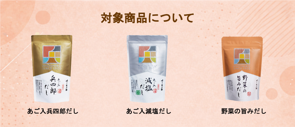 《対象商品》あご入兵四郎だし、あご入減塩だし、野菜の旨みだし